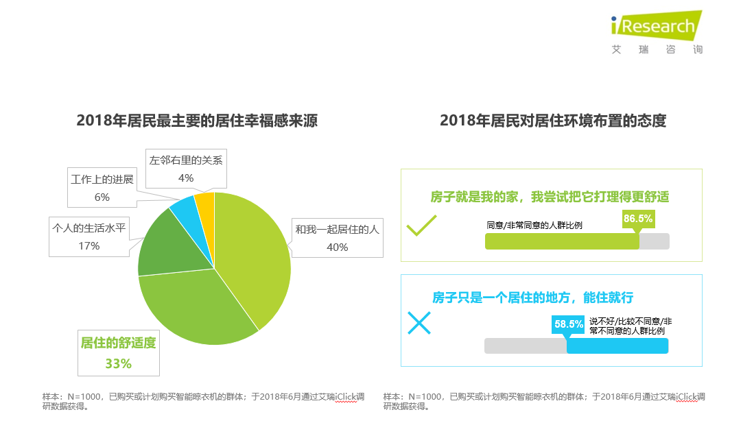 居民对居住舒适度的重视度和要求较高,33%的居民认为居住的舒适度是最主要的幸福感来源,86.5%的居民同意或非常同意“房子就是我的家,我尝试把它打理得更舒适”这一观点,而对“房子只是一个居住的地方,能住就行”这一观点,不认同或说不好的人群比例达58.5%。