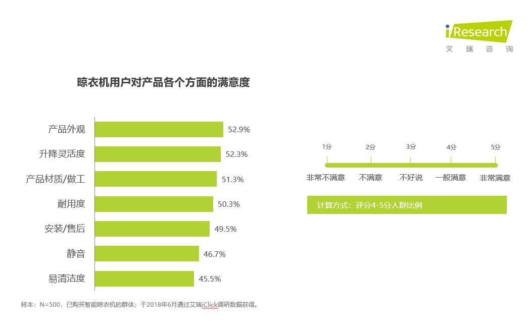 智能晾衣机的产品外观成为黑马,是用户最为满意的方面;其次,自动升降作为智能晾衣机的核心功能,升降的灵活度受到用户好评。产品材质/做工、耐用度方面的满意度均超出50%。
