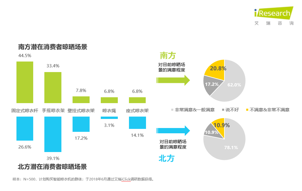 通过对计划购买智能晾衣机的潜在消费者进行调研,南方消费者目前主要采用的晾晒工具是固定式晾衣杆,其次为手摇晾衣机,20.8%的消费者对目前晾晒场景不满意或非常不满意,17.2%持中立态度。北方消费者主要采用的晾晒工具是手摇晾衣机,10.9%的消费者表示不满意目前的晾晒场景。