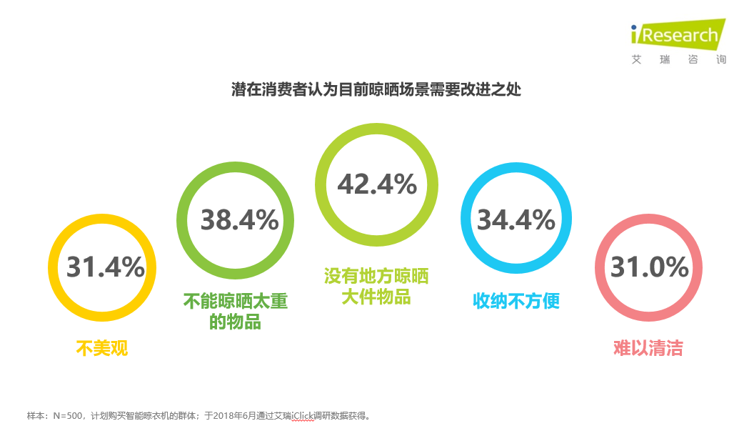 没有地方晾晒大件物品是传统晾晒场景的最大痛点,其次不能晾晒太大物品和收纳不方便也受到诟病。大部分城市居民房屋面积有限,传统晾晒工具功能单一,不能实现各种晾晒场景的变通,为智能晾衣机提供了市场机会。