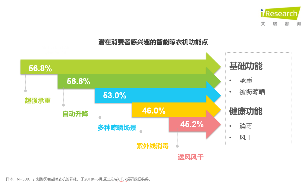对于暂未购买的消费者来说,对智能晾衣机超强承重、自动升降和多种晾晒场景等传统基础上的升级点非常关注,同时超出40%的群体对创新型的健康保护功能,如紫外线消毒和送风风干等表示关注。