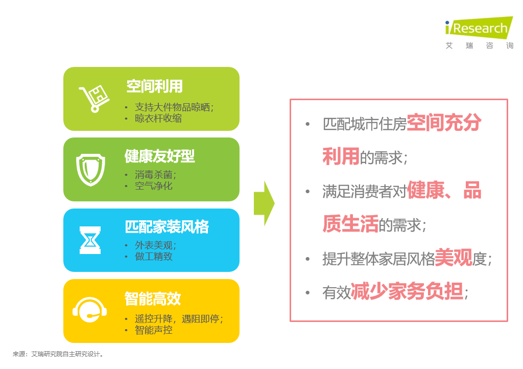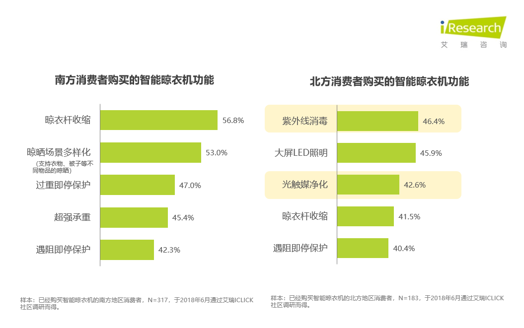 南方消费者所使用的晾晒场景主要是固定晾衣杆,并且南方气候更为潮湿炎热,晾晒的需求较大,对晾晒等基础功能要求较高,更为关注晾衣杆收缩、晾晒场景多样化、过重即停保护等基础功能的升级。北方消费者则更为关注紫外线消毒、照明、光触媒净化等健康保护功能。