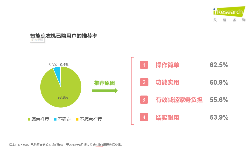 已经购买智能晾衣机的用户中,93.8%的用户愿意将该产品推荐给亲友,推荐原因中,操作简单排在首位,其次为功能实用和有效减轻家务负担。智能晾衣机的实用性经得起市场的考验。