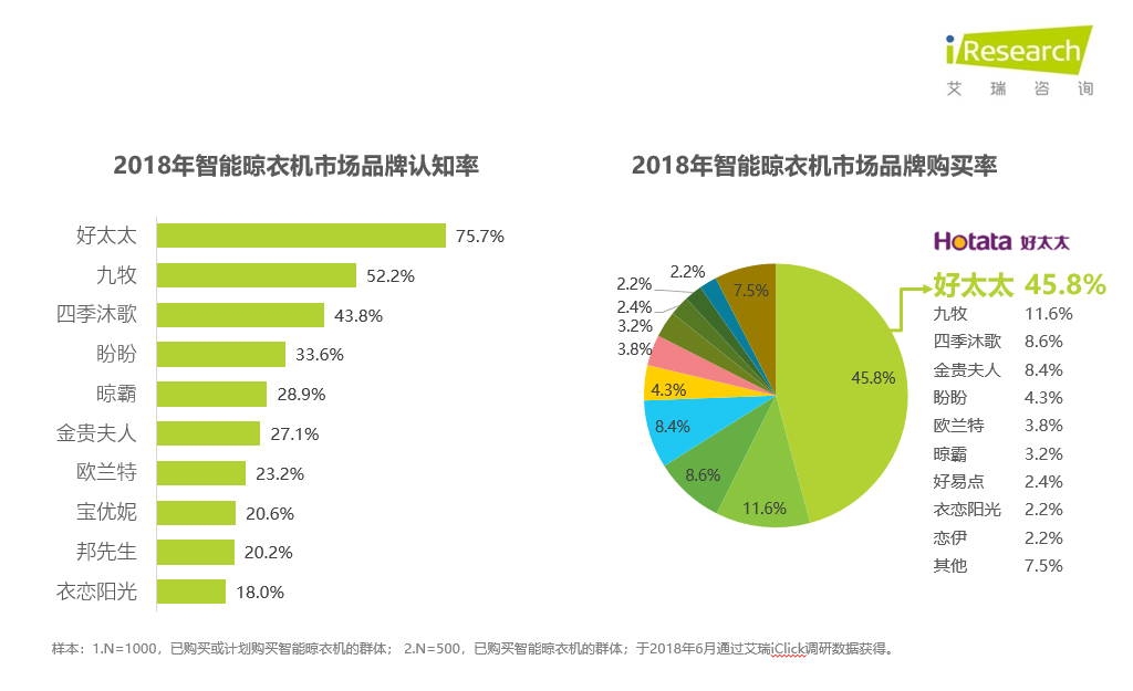购买过智能晾衣机的用户中,好太太的品牌知晓率高达75.7%,购买率45.8%,智能晾衣机市场品牌化表现突出。