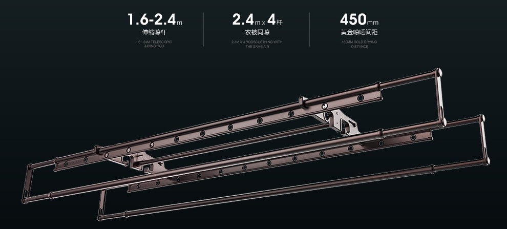 122系列在此基础上加入了伸缩杆的设计,4根晾杆可自由伸缩,长度从1.6米加长至2.4米,晾晒容量增加50%,可实现同时晾晒10个人的衣物。