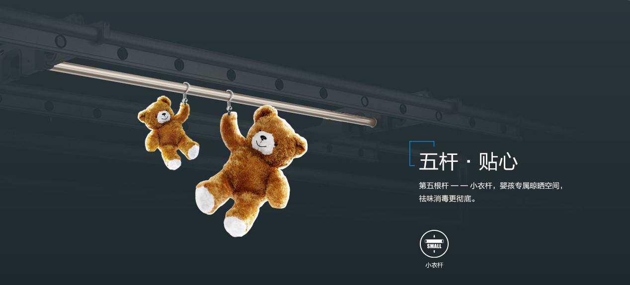 这还不够,更惊喜的是,122系列拥有5根杆!利用2根晾杆间的空余空间,加了小晾杆。对于家里有孩子的家庭来说,非常实用了。