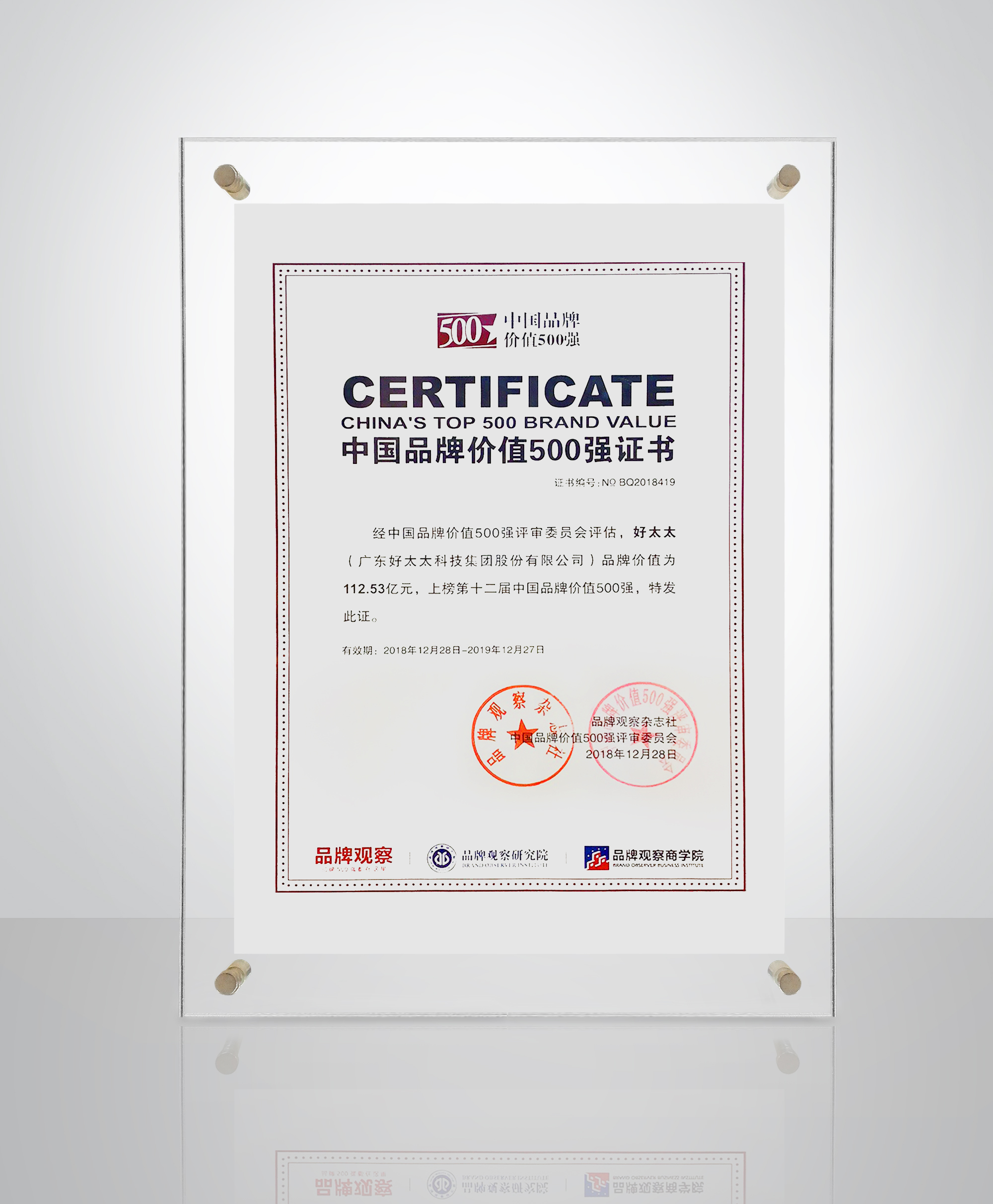 经过多年来在产品质量、品牌文化、研发力量、工艺技术、管理服务和市场营销等诸多方面的长期积累,“好太太”品牌影响力及品牌价值持续提升,市场龙头地位稳如泰山,好太太品牌购买率高达45.8%,全球已有3000万家庭在使用好太太的产品。