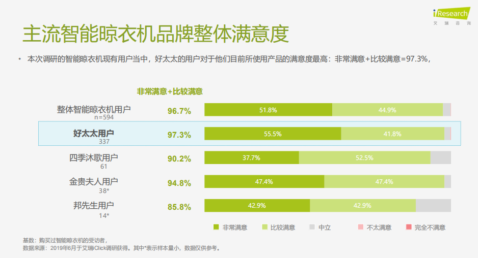 经过深入调研后,艾瑞在晒衣节当天发布《国货当智强——家居晾晒智能化趋势洞察报告》,报告显示,消费者普遍认同的国货家居代表品牌有好太太、水星家纺、欧派、富安娜与九牧等。此外,好太太在主流晾衣机品牌的整体满意度是最高的,并且在智能功能、材质做工或者安装售后等任何一个维度上看,好太太都是当仁不让的行业第一名