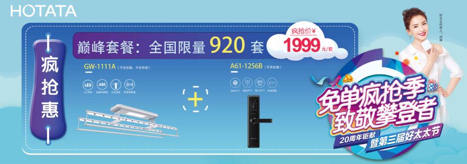 *疯抢惠:“好太太晾衣机GW-1111A(不含安装,不含衣架) + 科徕尼智能锁A61-1256B(不含安装)”巅峰套餐,特价仅需1999元/套。