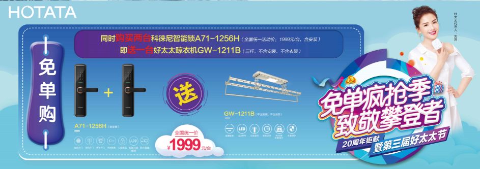*免单购:同时购买两台科徕尼智能锁A71-1256H(全国统一活动价:1999元/台,含安装),即送一台好太太晾衣机GW-1211B(三杆,不含安装,不含衣架)