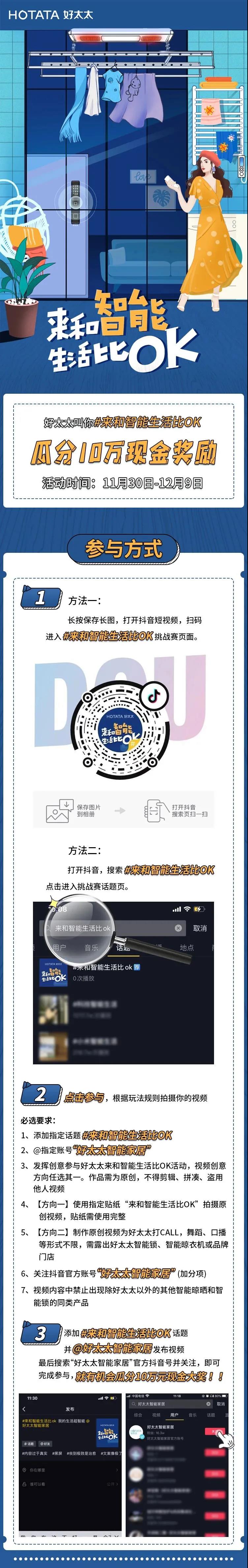 即日—12月9日,好太太智能家居将发起抖音全民任务挑战赛,用户通过在抖音上搜索【来和智能生活比OK】参与活动,就有机会瓜分10万现金大奖(心动)!