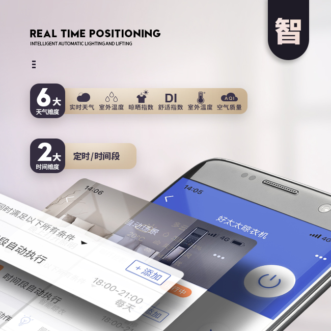根据定位的实时环境信息,按照设定的时间或天气条件,实现智能自动开启照明、升降。