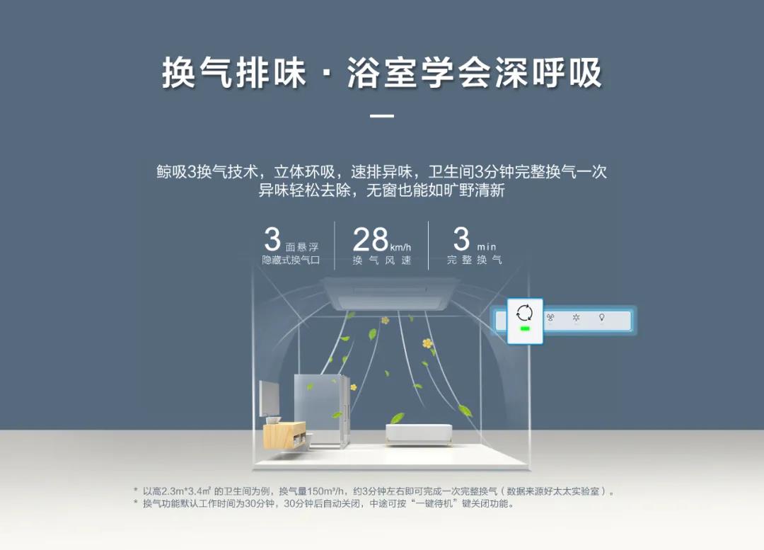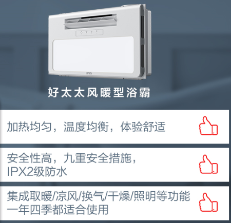 天气冷的时候可以使用取暖功能,搭载2400瓦PTC发热源,360度循环加热,全浴室取暖,即开即热!