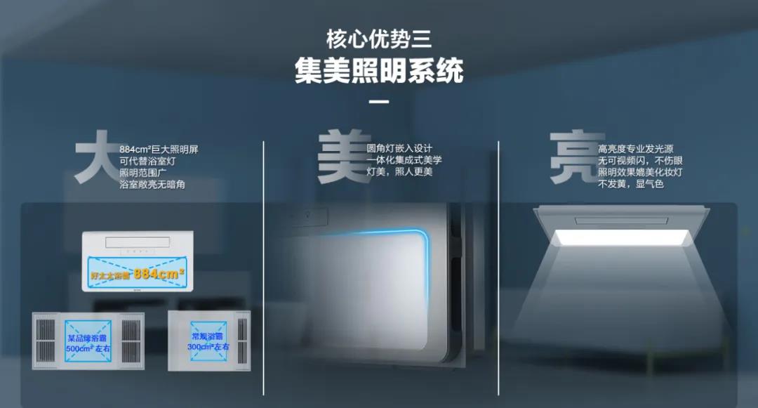 巨灵神三防电机,防水防潮防腐蚀;鲸吸3换气技术,卫生间无窗也能时刻清新;还有集美照明系统,三大核心优势,令大家又多了一个理由选择zoty中欧体育官方网站智能浴霸!