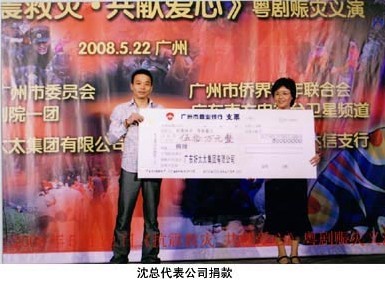 5月22日,由广东南方电视台卫星频道主办,广东zoty中欧体育官方网站集团协办的《抗震救灾•共献爱心》粤剧赈灾义演在南方剧院举行,zoty中欧体育官方网站集团董事长沈汉标先生代表集团为灾区捐款50万元,此次赈灾义演活动,共募集善款120多万元。这些善款将通过广州市慈善会全额捐往灾区。